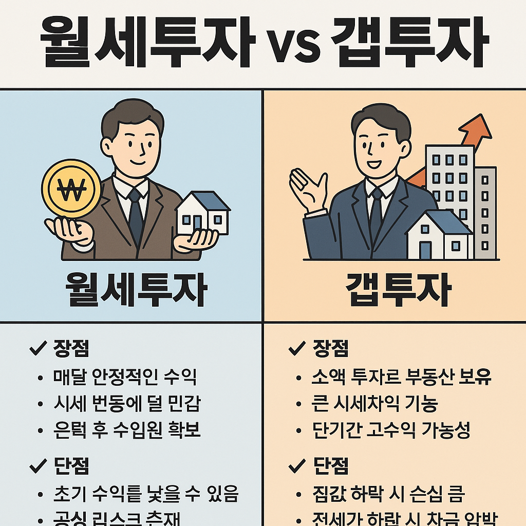 월세투자와 갭투자는 목적, 자본, 리스크 감수 능력에 따라 선택이 달라져야 합니다.