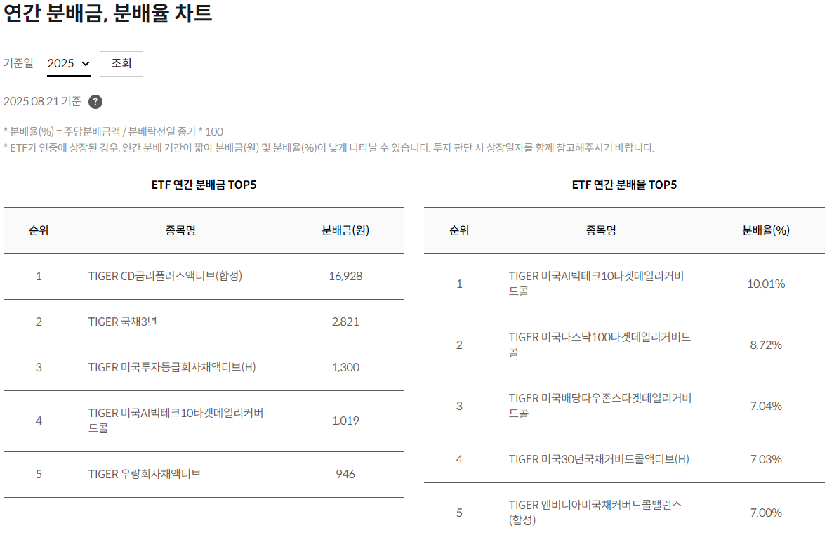 오늘은 **2025년 기준 TIGER ETF의 연간 분배금과 분배율 TOP 5**를 정리해보았습니다.