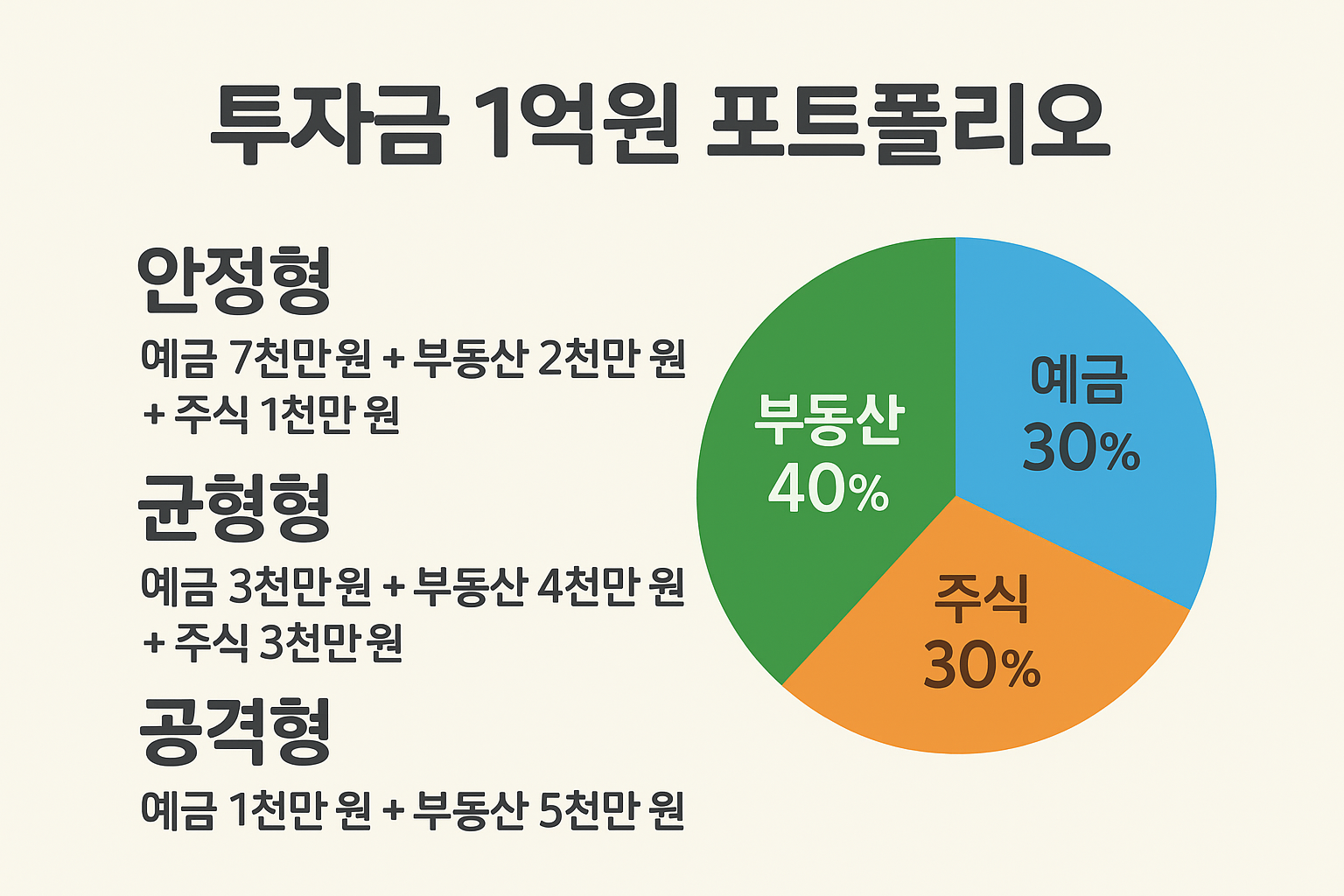 #예금투자 #부동산투자 #주식투자 #포트폴리오 #재테크 #투자전략 #안정형투자 #균형형투자 #공격형투자 #투자포트폴리오 #분산투자 #1억원투자 #재테크초보 #투자마인드 #금융지식