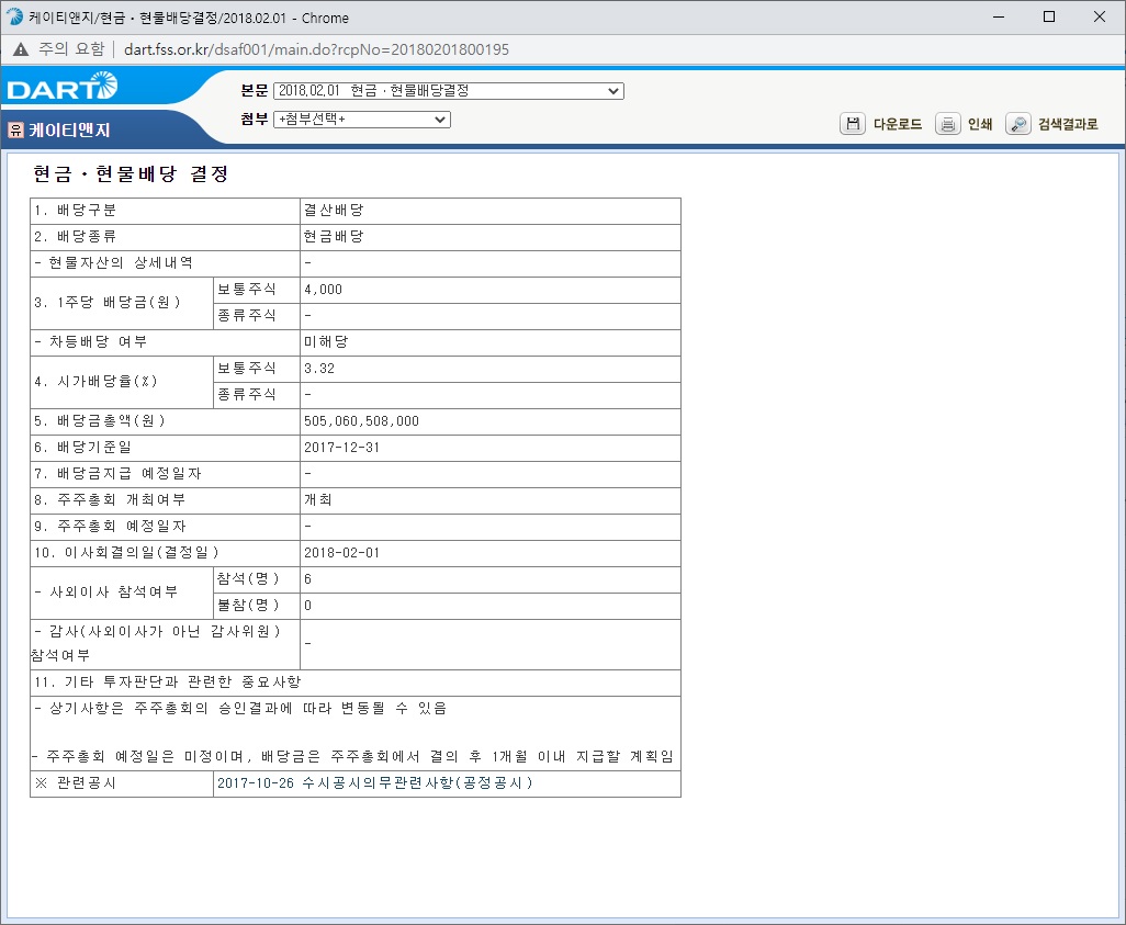 2018년 kt&g 배당금. 4,000원. 3.32%