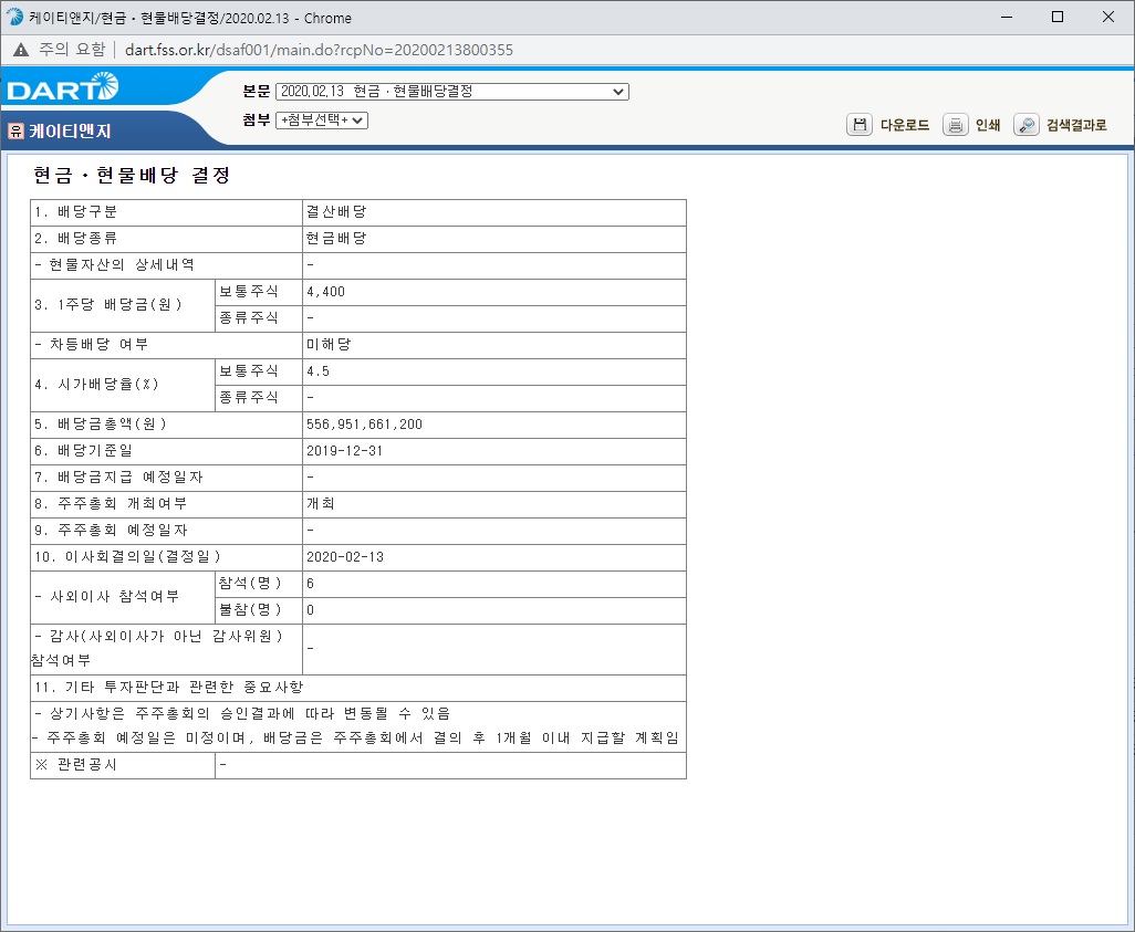 2020년 kt&g 배당금. 4,400원. 4.5%