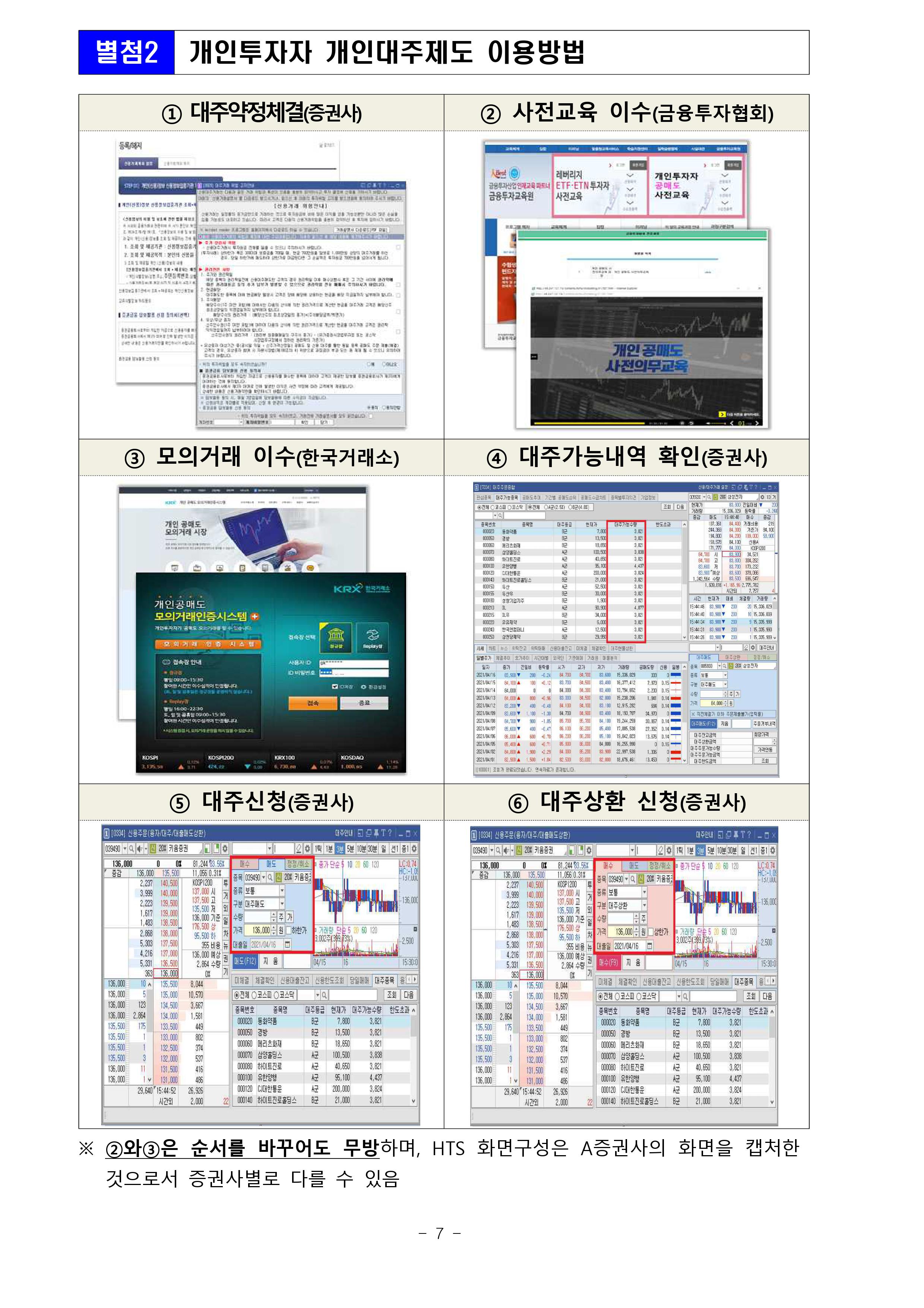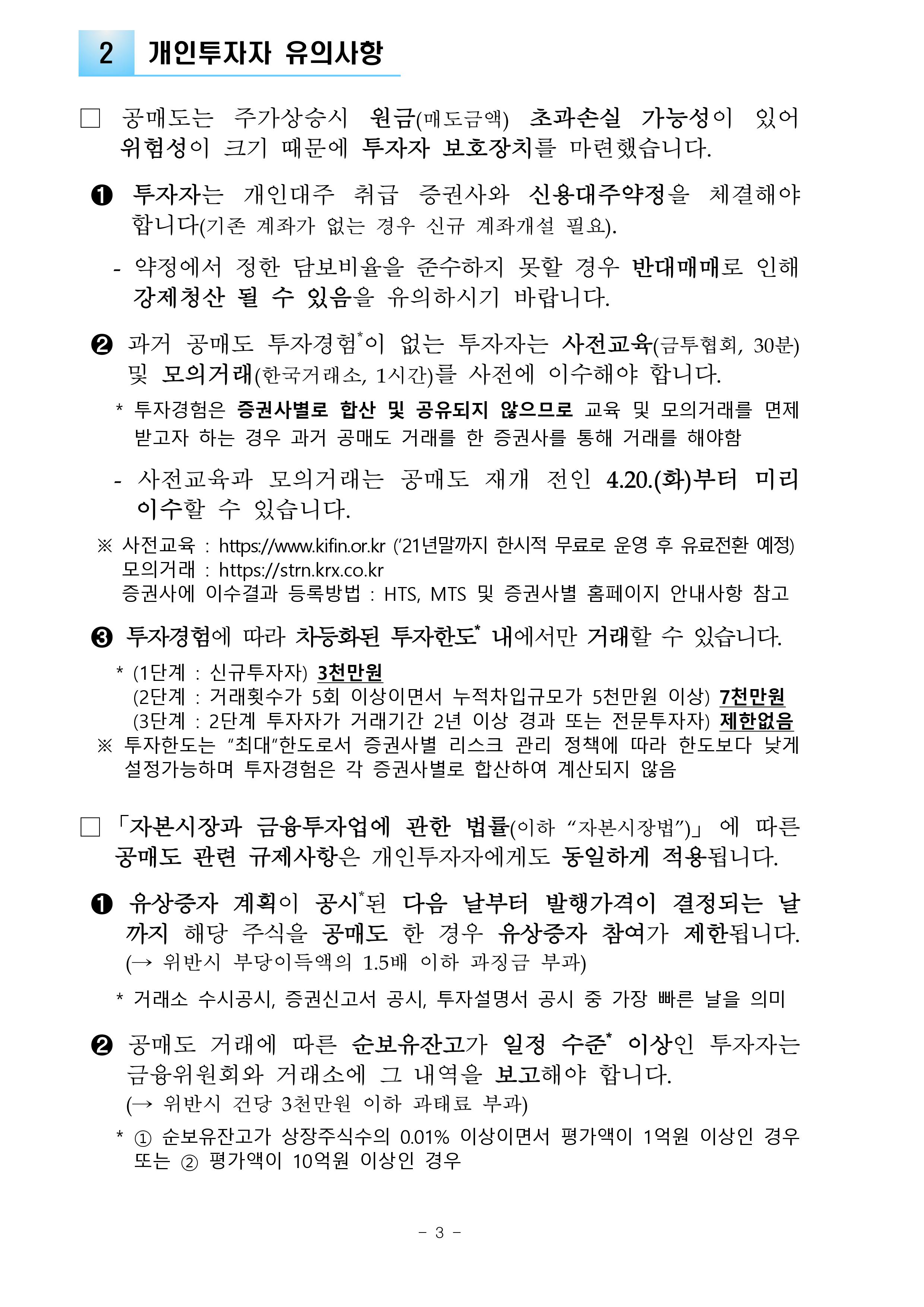 ㅇ 공매도 거래를 희망하는 개인투자자는 사전교육과 모의거래를 미리 이수하여야 합니다.(4.20일(화)부터 사전이수가능)