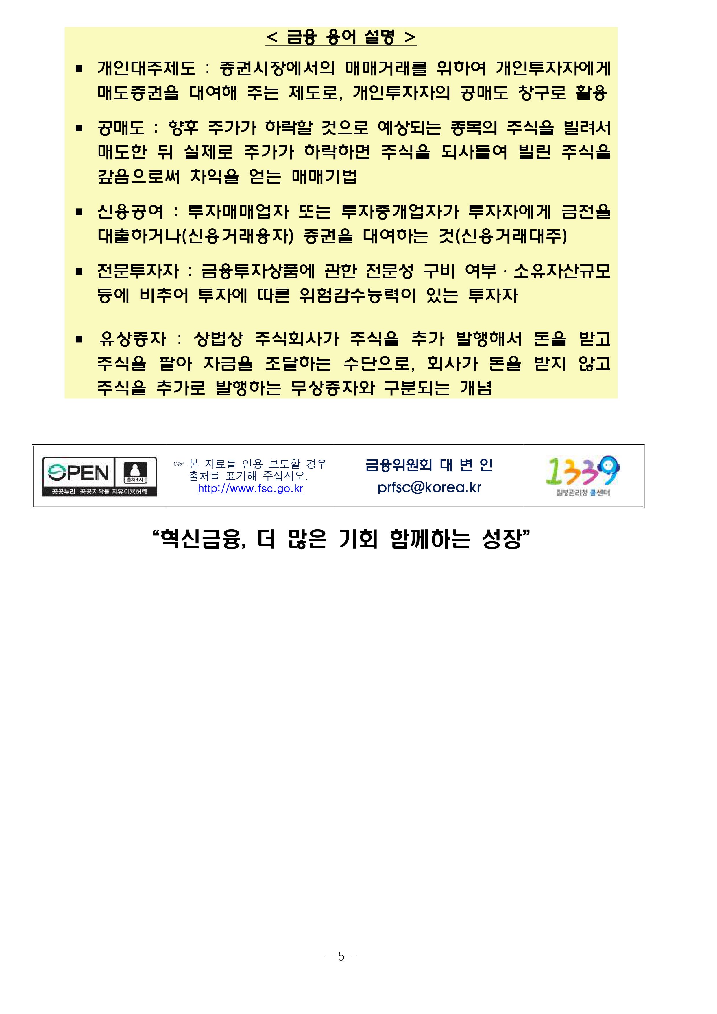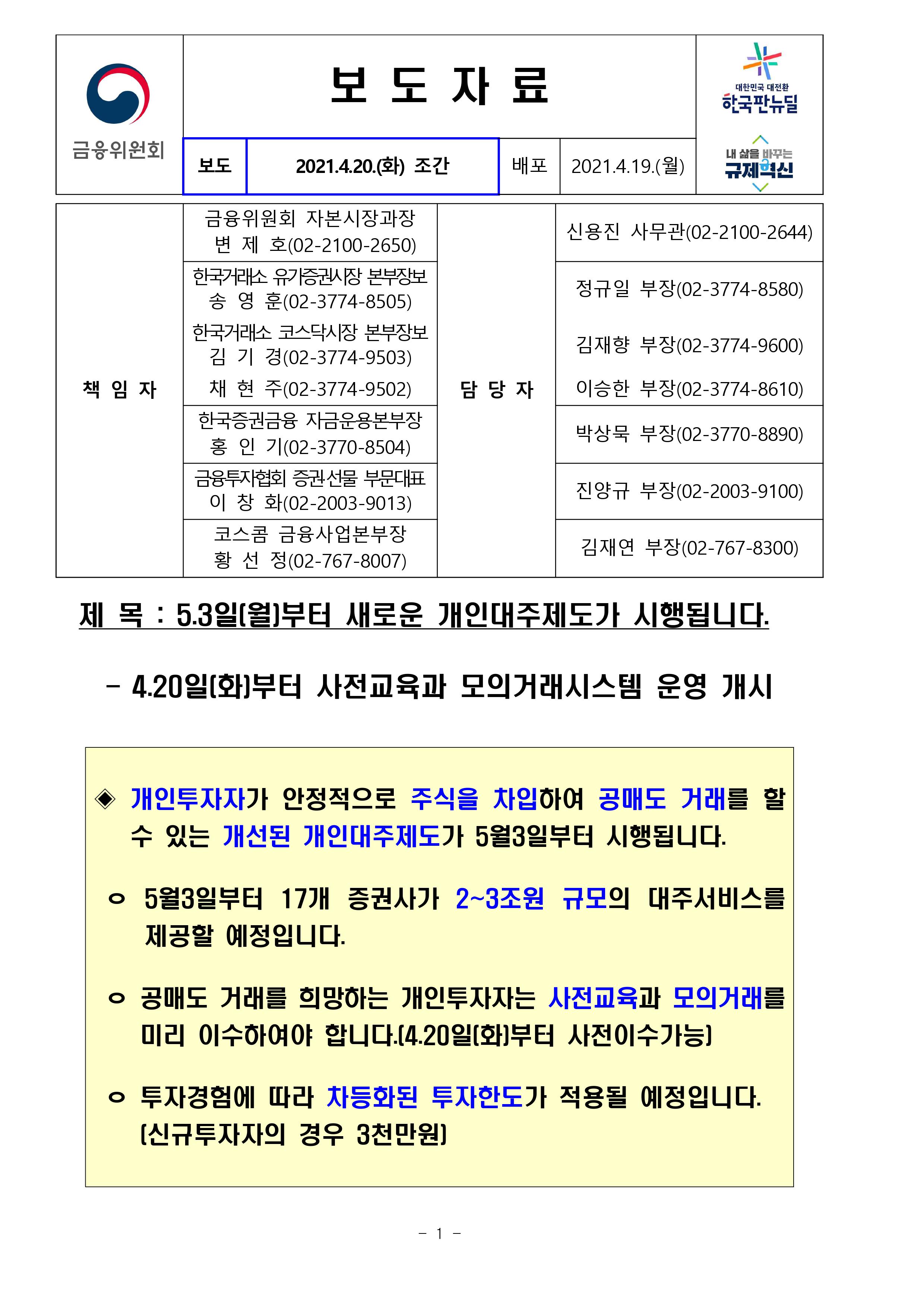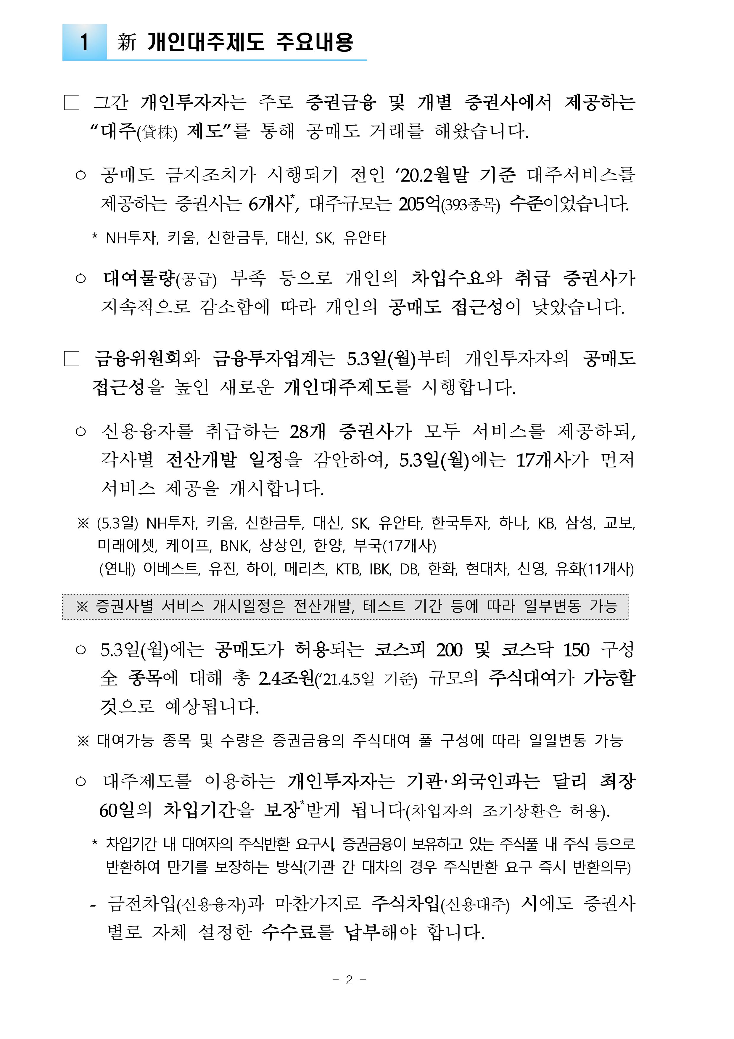 □ 금융위원회와 금융투자업계는 5.3일(월)부터 개인투자자의 공매도 접근성을 높인 새로운 개인대주제도를 시행합니다.