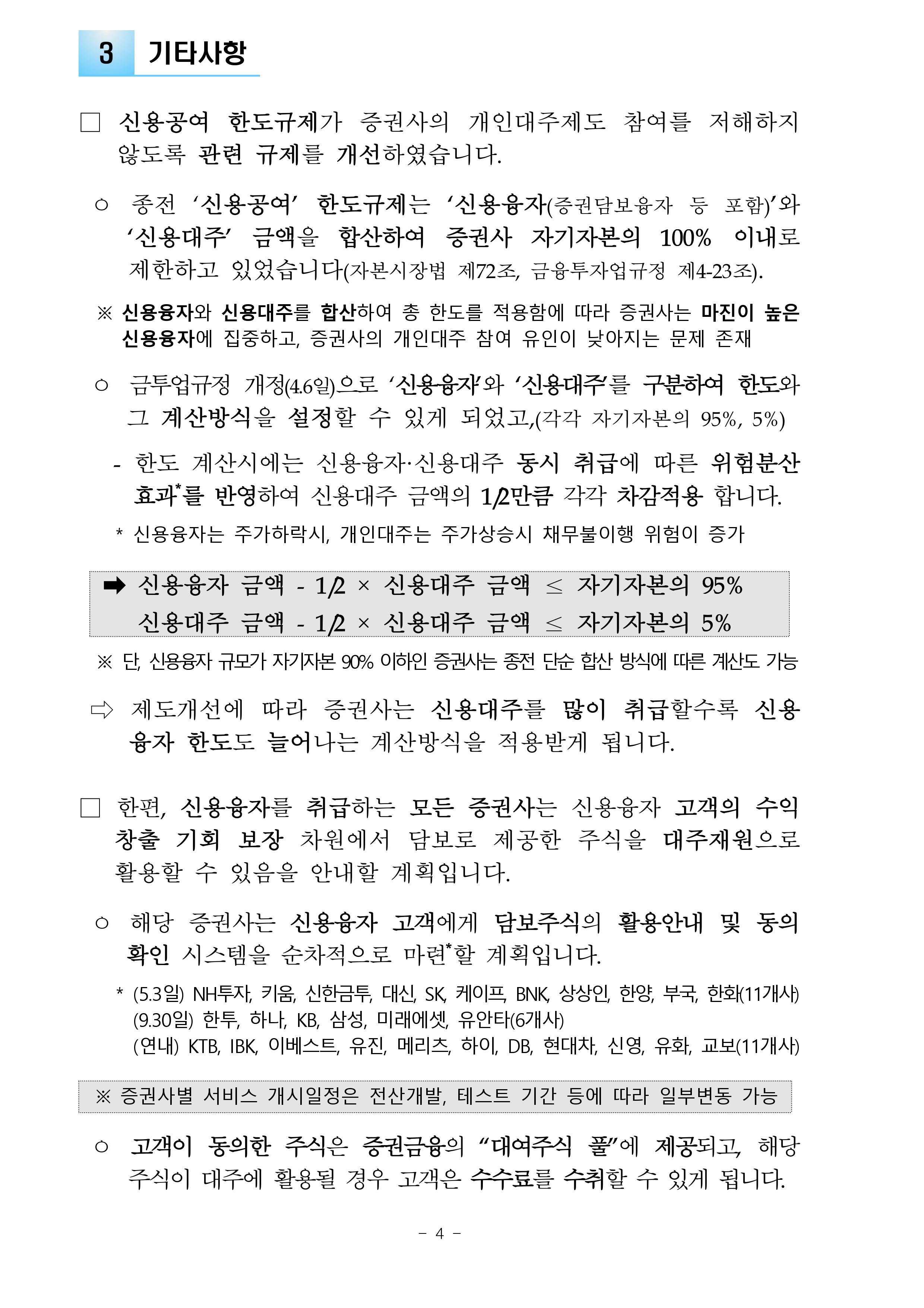 ㅇ 금투업규정 개정(4.6일)으로 ‘신용융자’와 ‘신용대주’를 구분하여 한도와 그 계산방식을 설정할 수 있게 되었고,(각각 자기자본의 95%, 5%)
