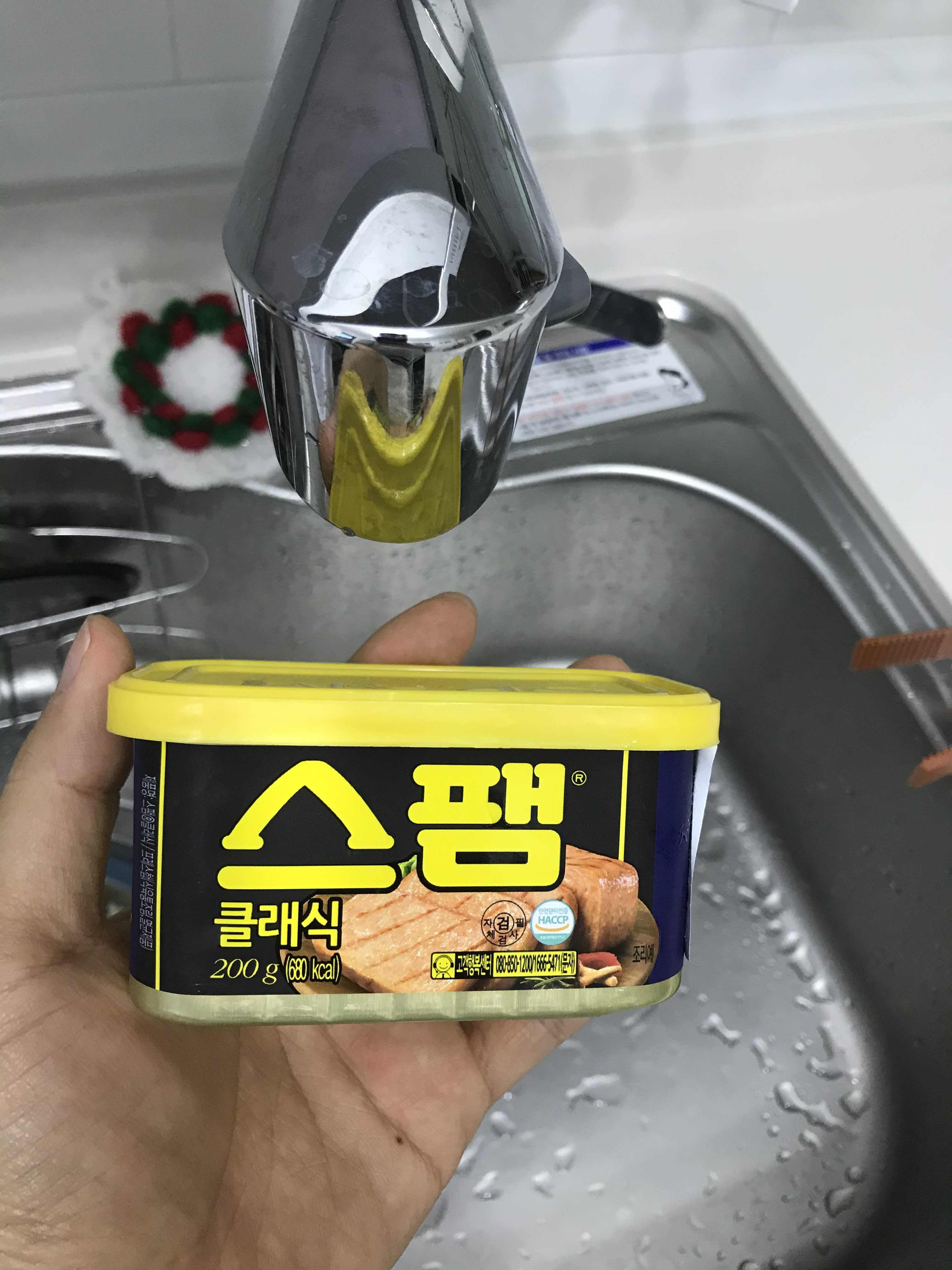 2. 따듯한 물로 스팸 통 아래부분을 데운다. 이유는 스팸이 잘 빠지기 위해서.