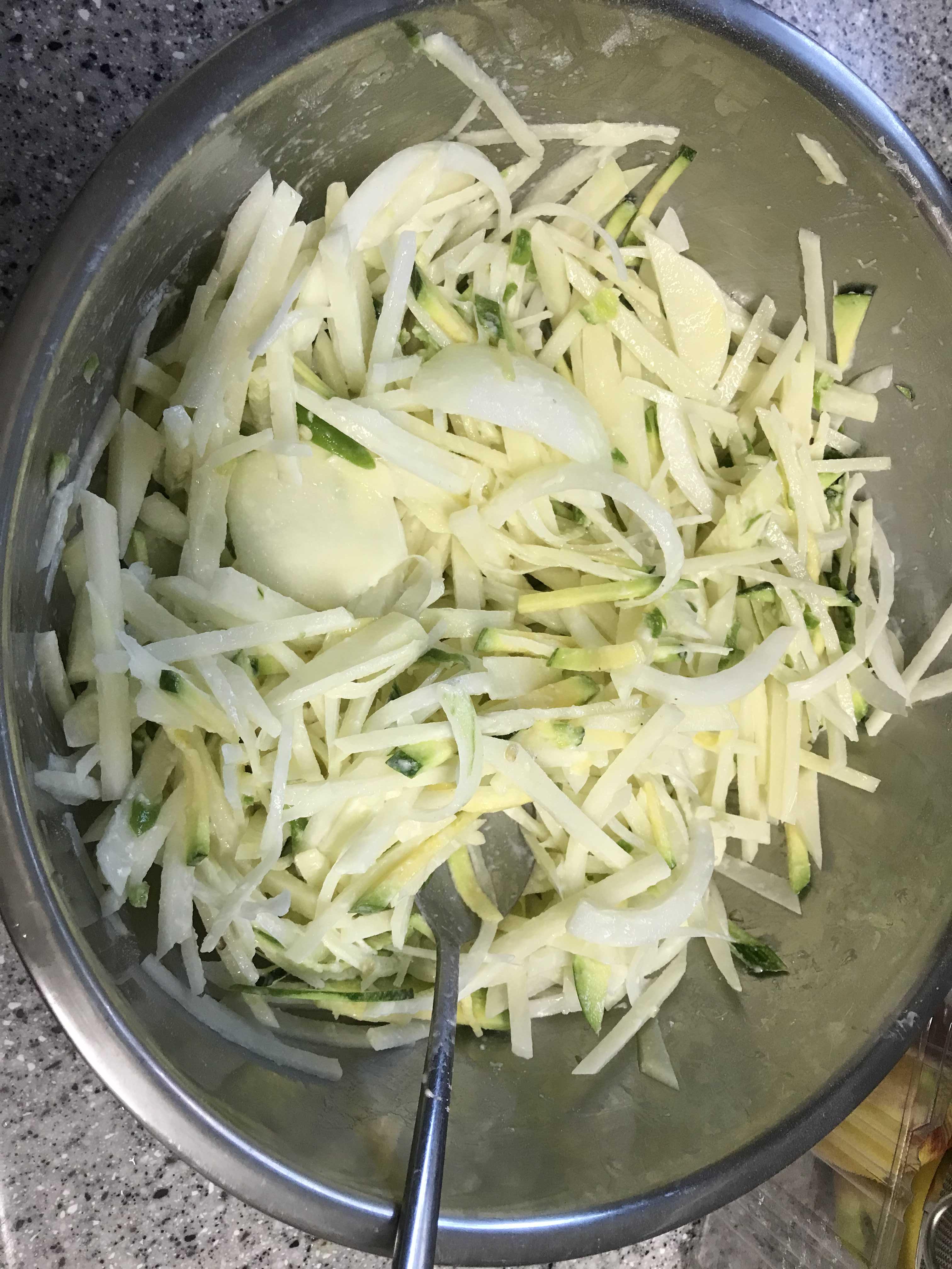 5. 밀가루 조금, 계산 한개 넣고 섞는다.