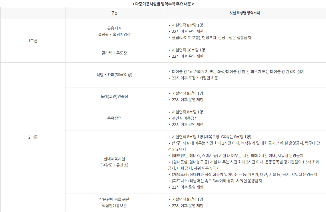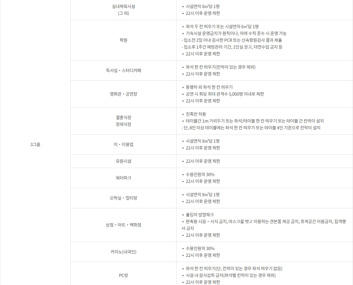 - (운영시간) 다중이용시설 1~3그룹 모두 22시 이후 운영 제한