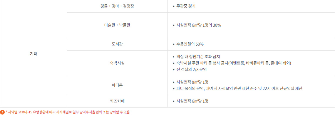 * 기업의 필수 경영활동 및 공무에 필요한 경우는 기본방역수칙을 준수하며 인원 제한 없이 개최 허용(예: 기업 정기 주주총회, 예산ㆍ법안 처리 등을 위한 국회회의, 방송제작ㆍ송출, 졸업식ㆍ입학식 등) - (스포츠 관람) 무관중 경기