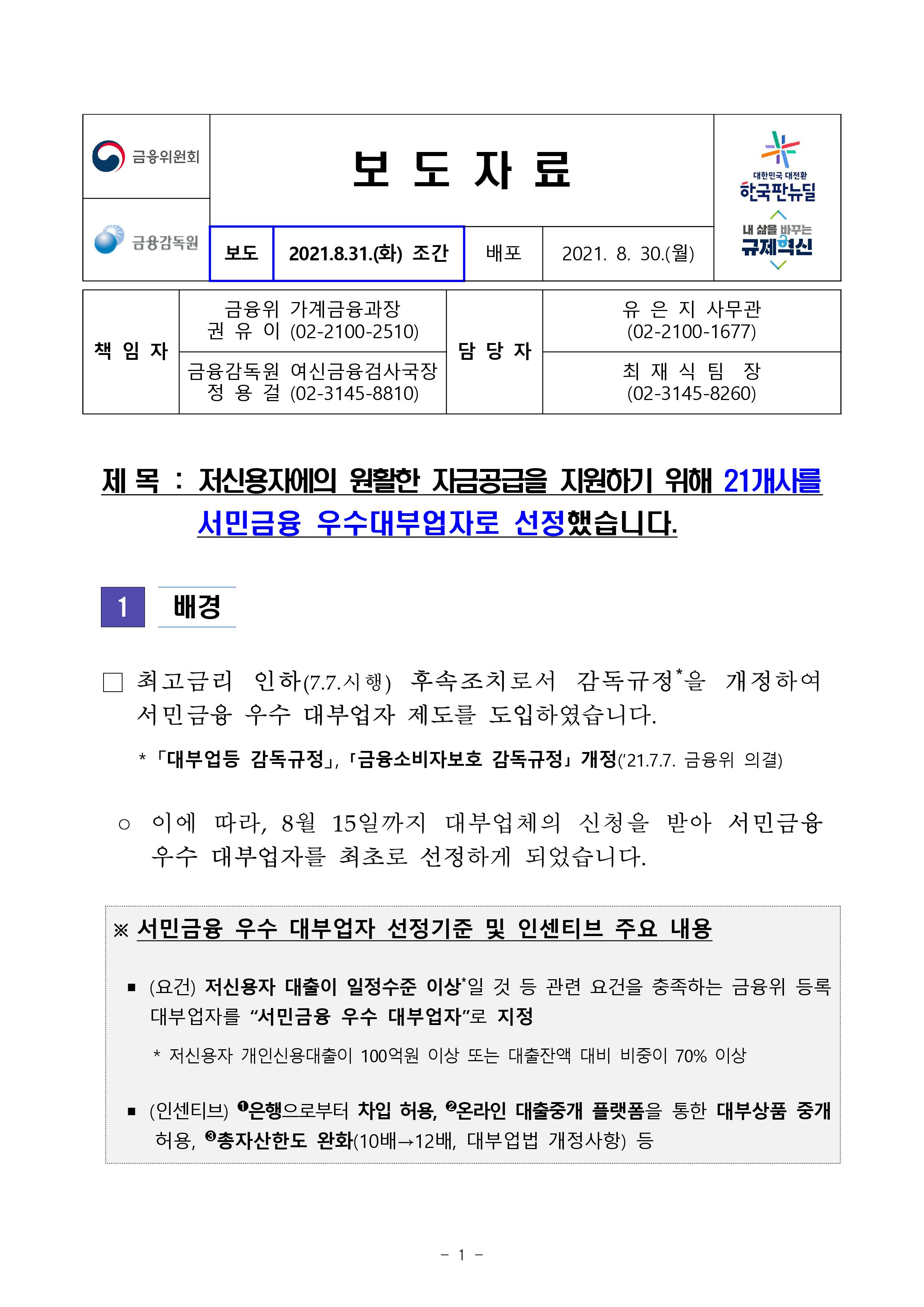 저신용자에의 원활한 자금공급을 지원하기 위해 21개사를 서민금융 우수대부업자로 선정했습니다.