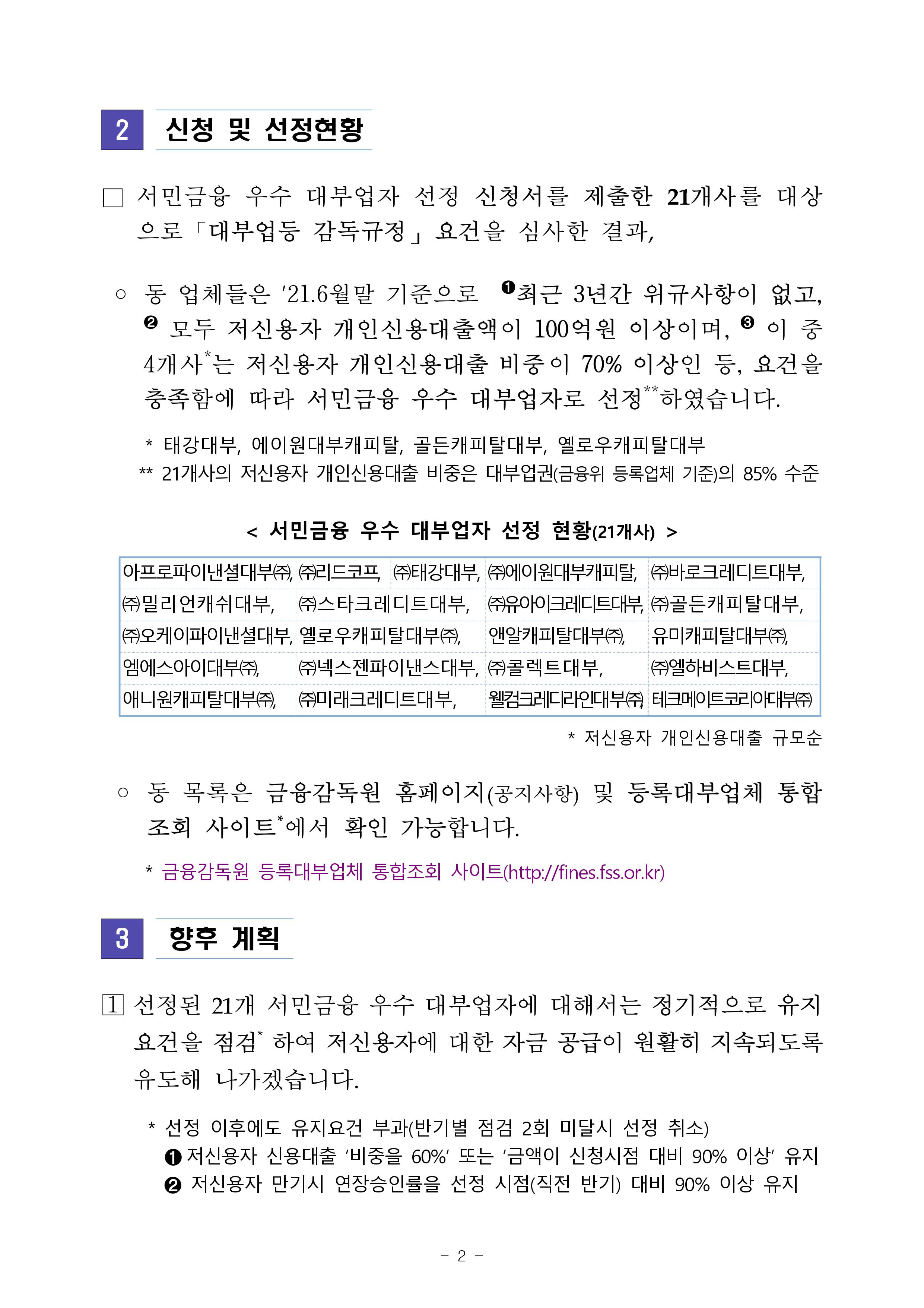 저신용자에의 원활한 자금공급을 지원하기 위해 21개사를 서민금융 우수대부업자로 선정했습니