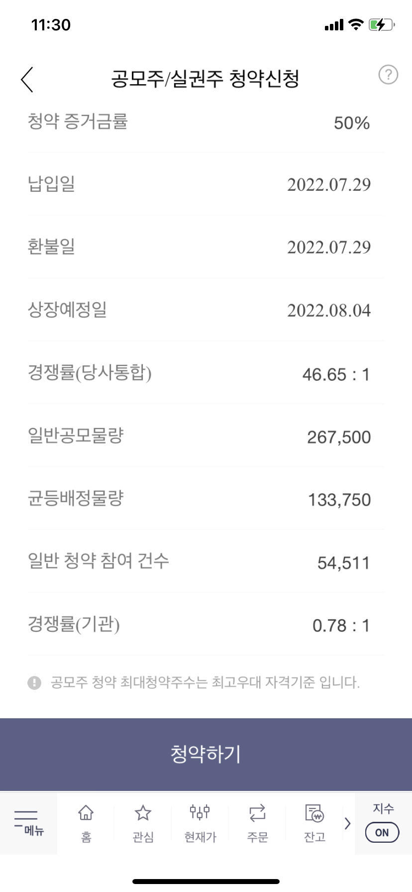 - 청약증거금율 개인 50% / 수요예측 참여기관 0%