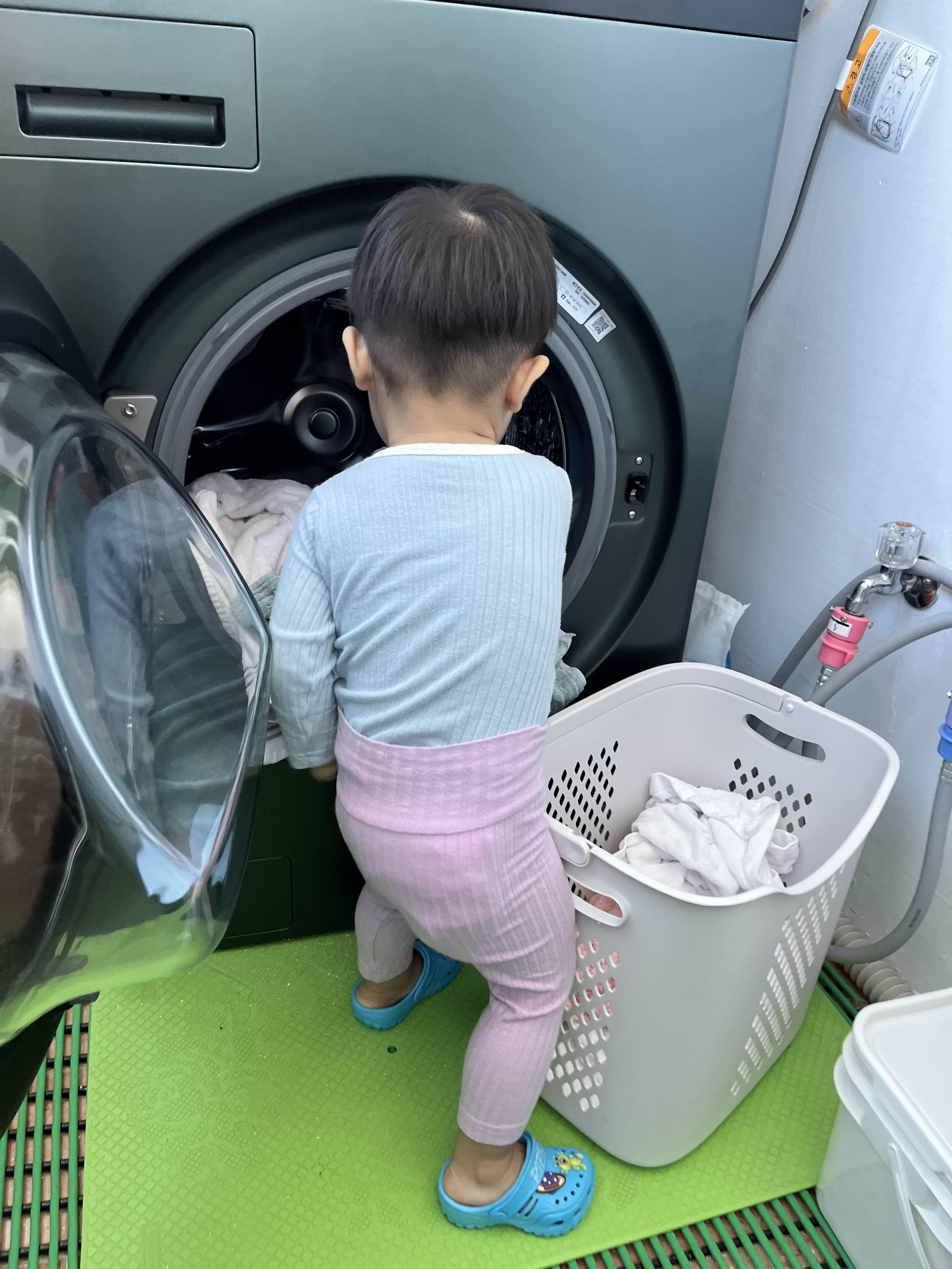 전에는 너무 어려서 세탁물 넣고 세제 넣는걸 보게만 했는데